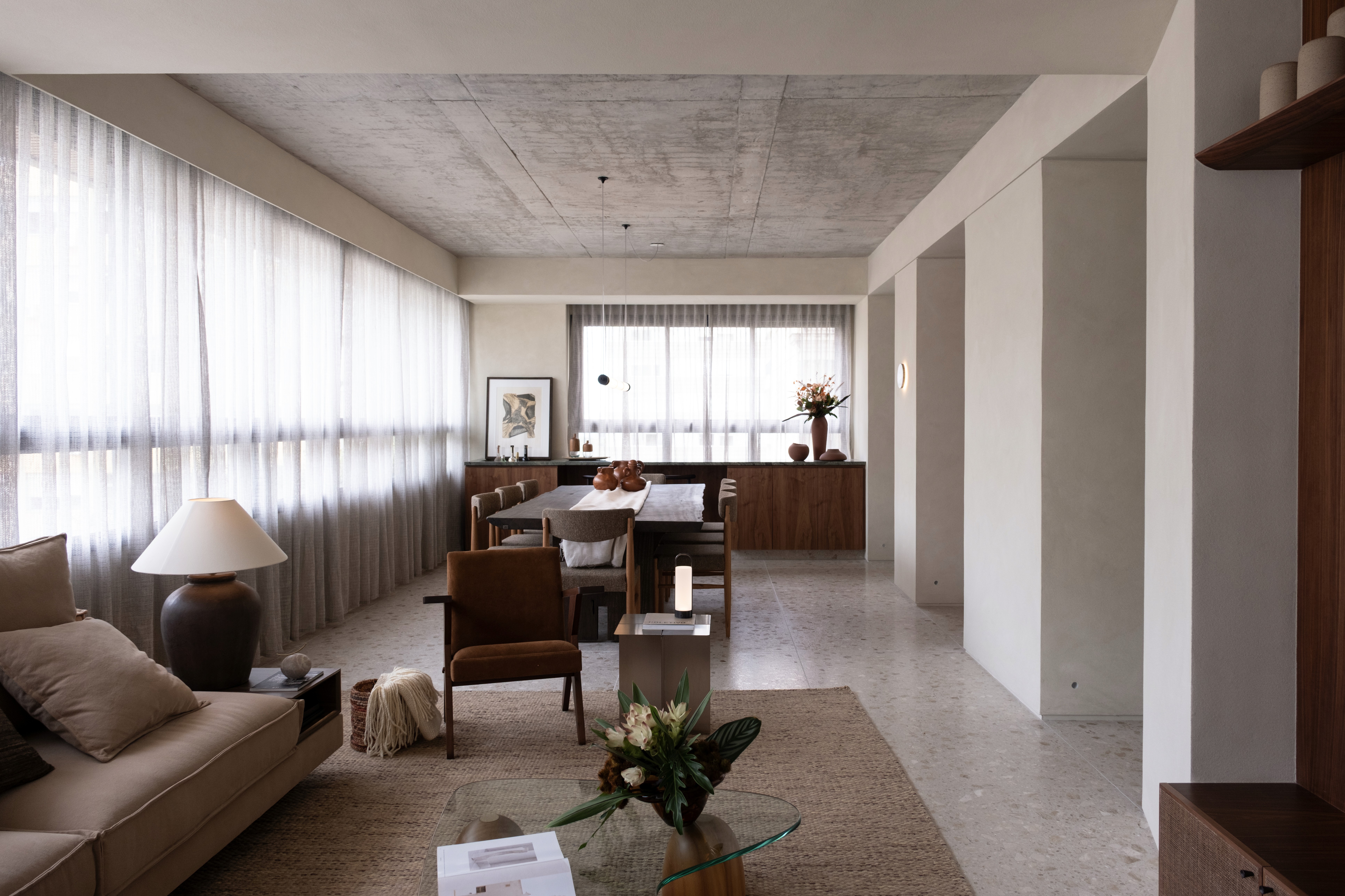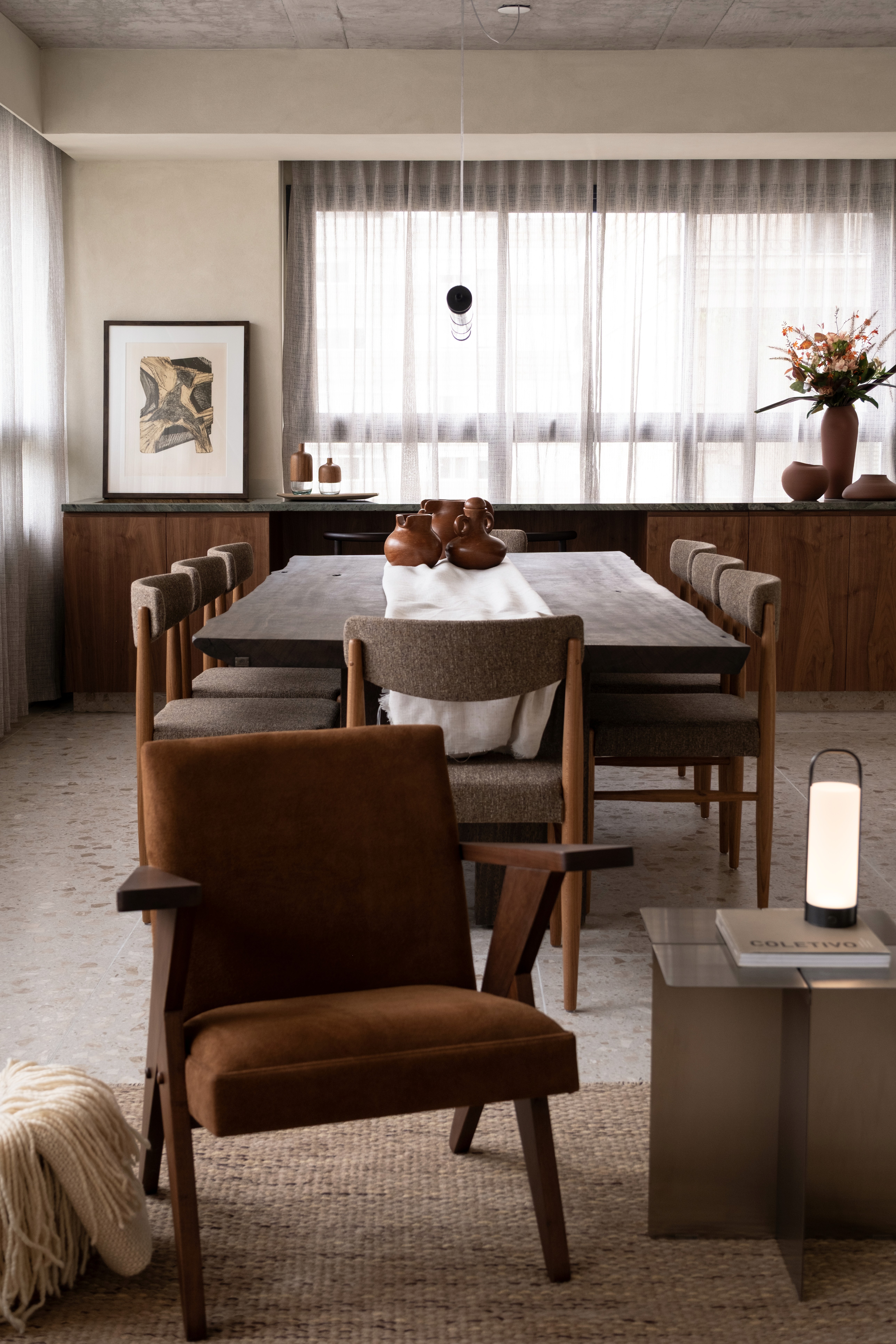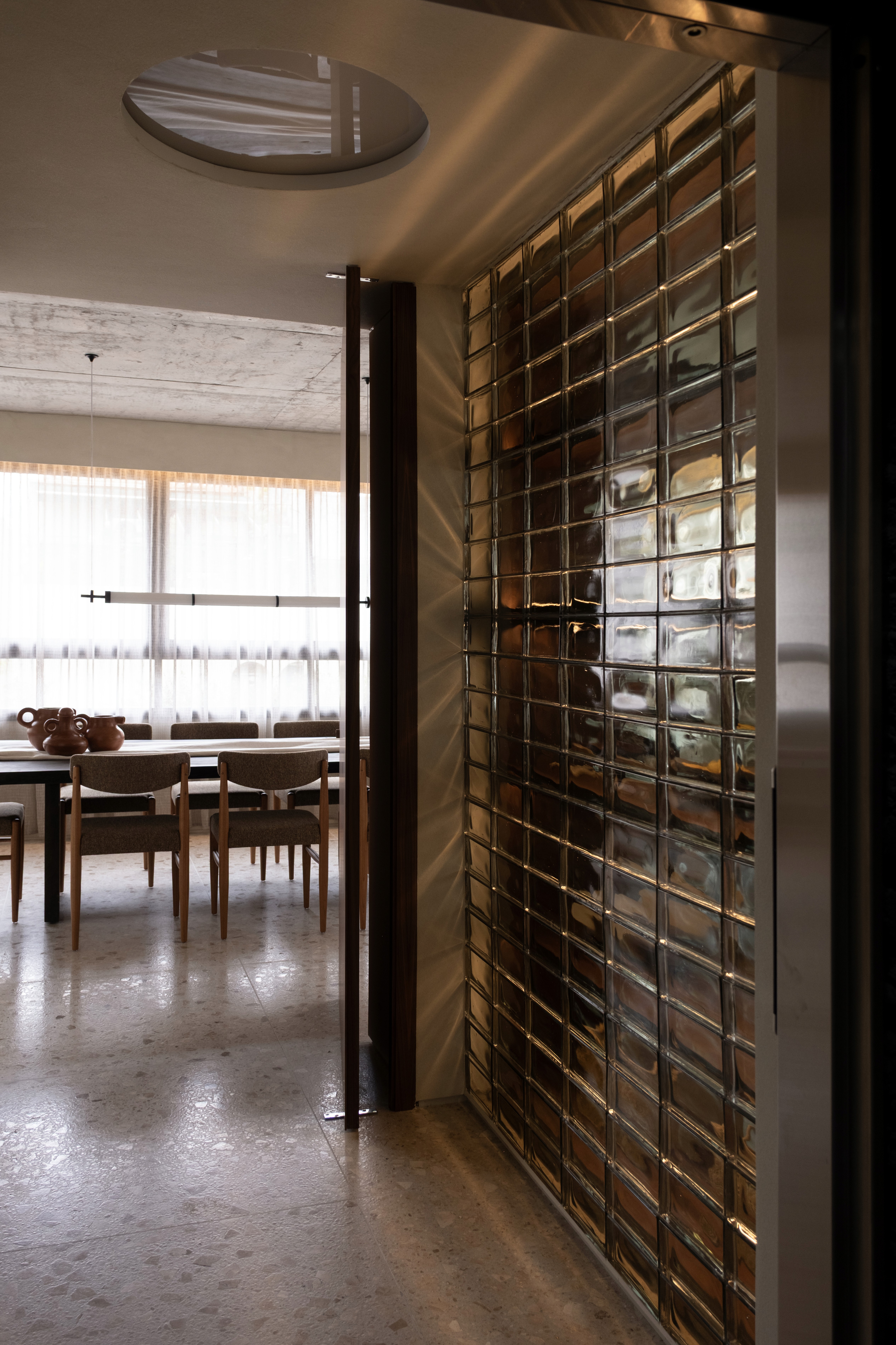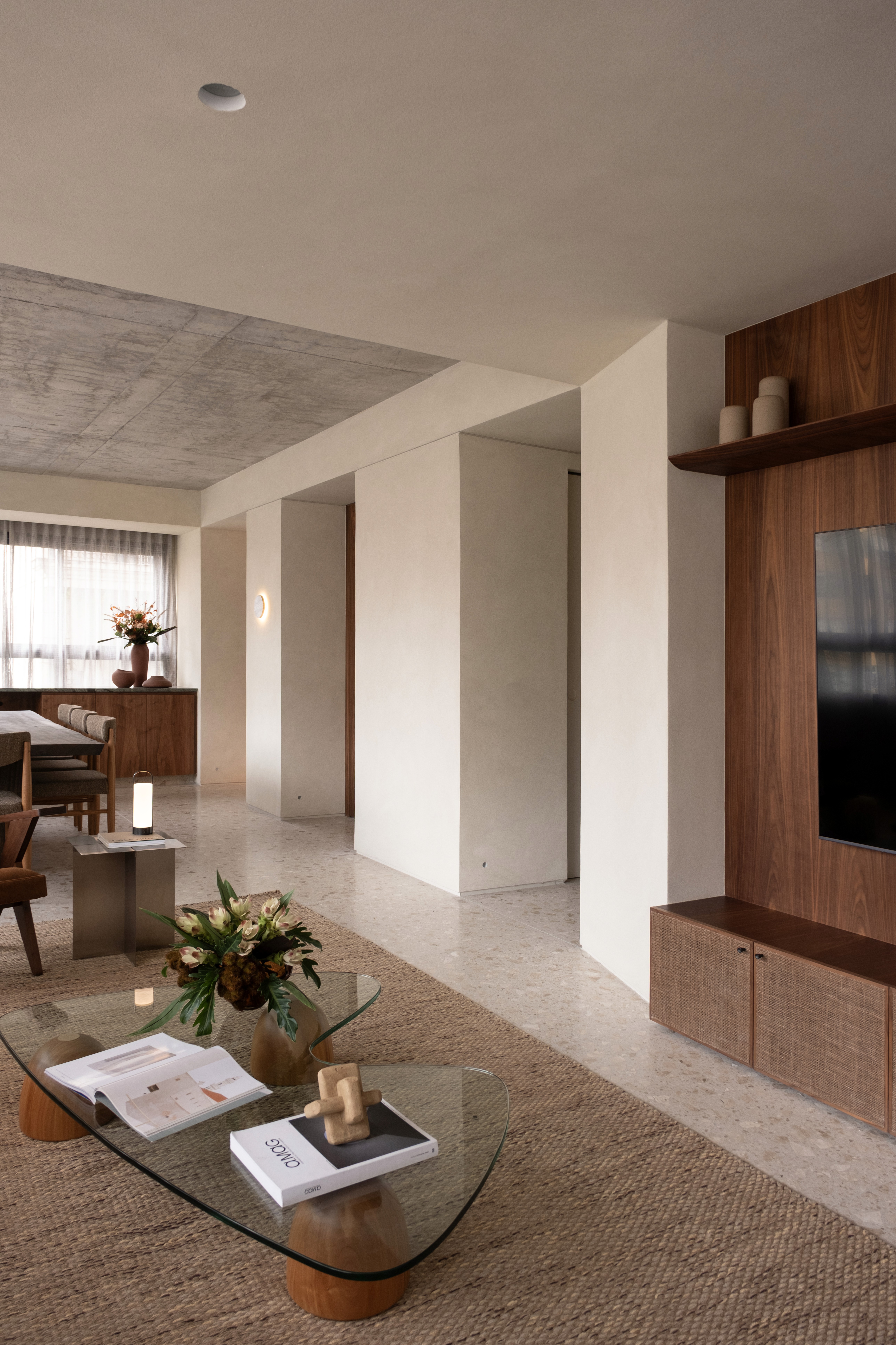 O projeto se caracteriza por uma paleta de tons terrosos e pela integração entre cozinha, estar e jantar, criando um espaço contínuo e fluido para o cotidiano. A simetria dos vãos orienta o partido arquitetônico, estabelecendo um ritmo entre os blocos de paredes e organizando a percepção do ambiente. O teto em concreto aparente foi mantido, ampliando o pé-direito e reforçando a sensação de amplitude. O piso em terrazzo, a bancada em mármore verde e o bloco de vidro no hall compõem uma atmosfera acolhedora e atemporal, onde materialidade e luz constroem a identidade do espaço.