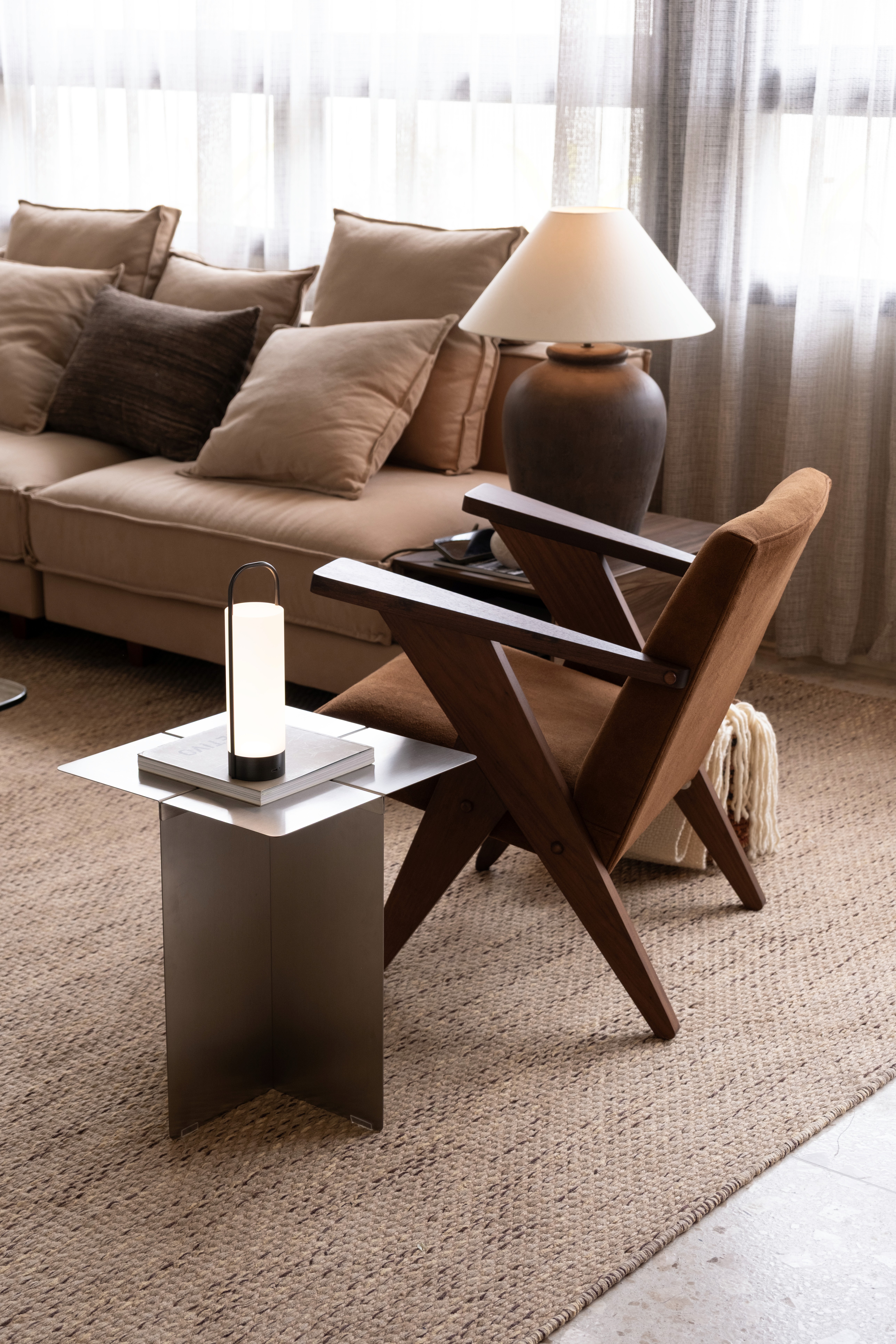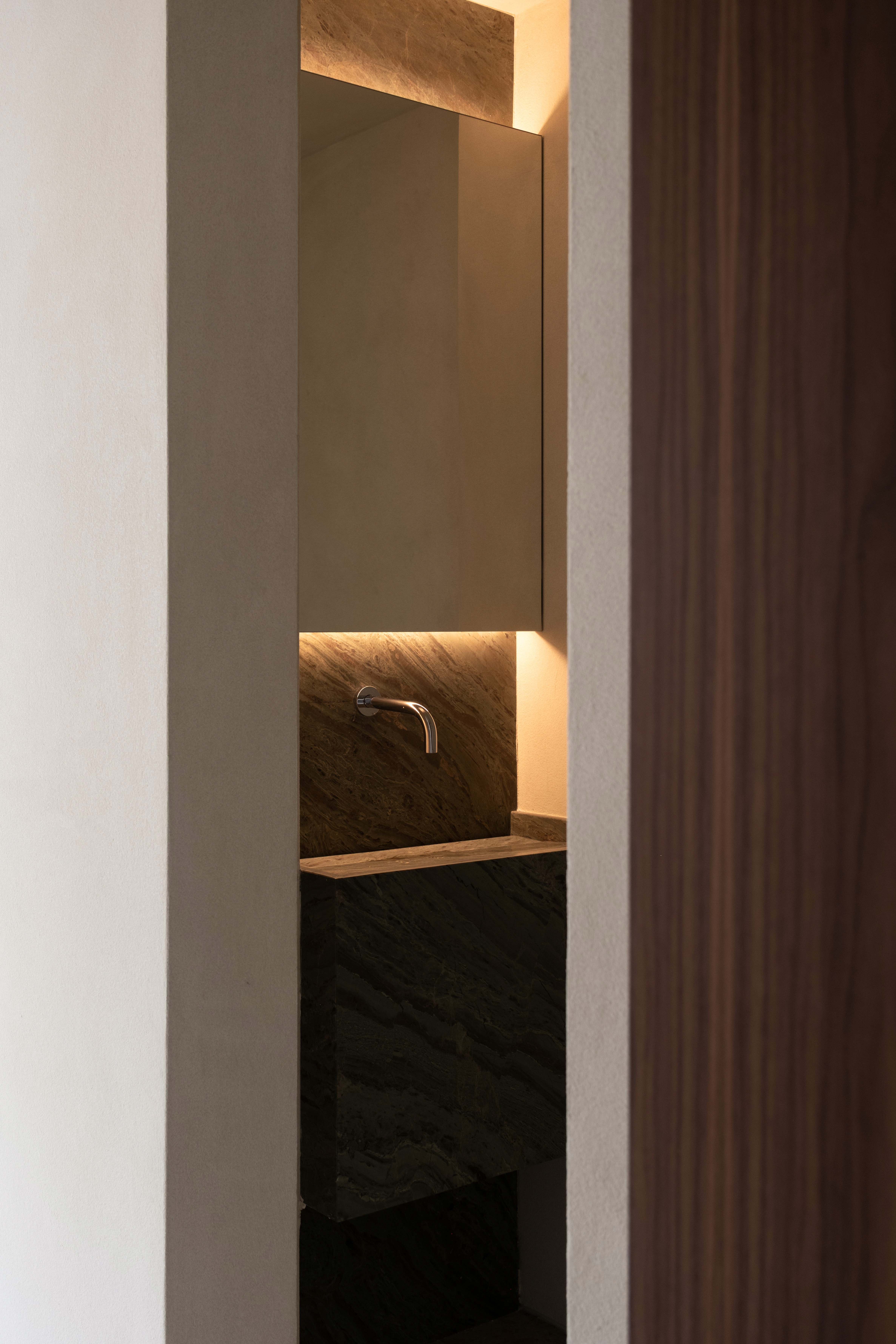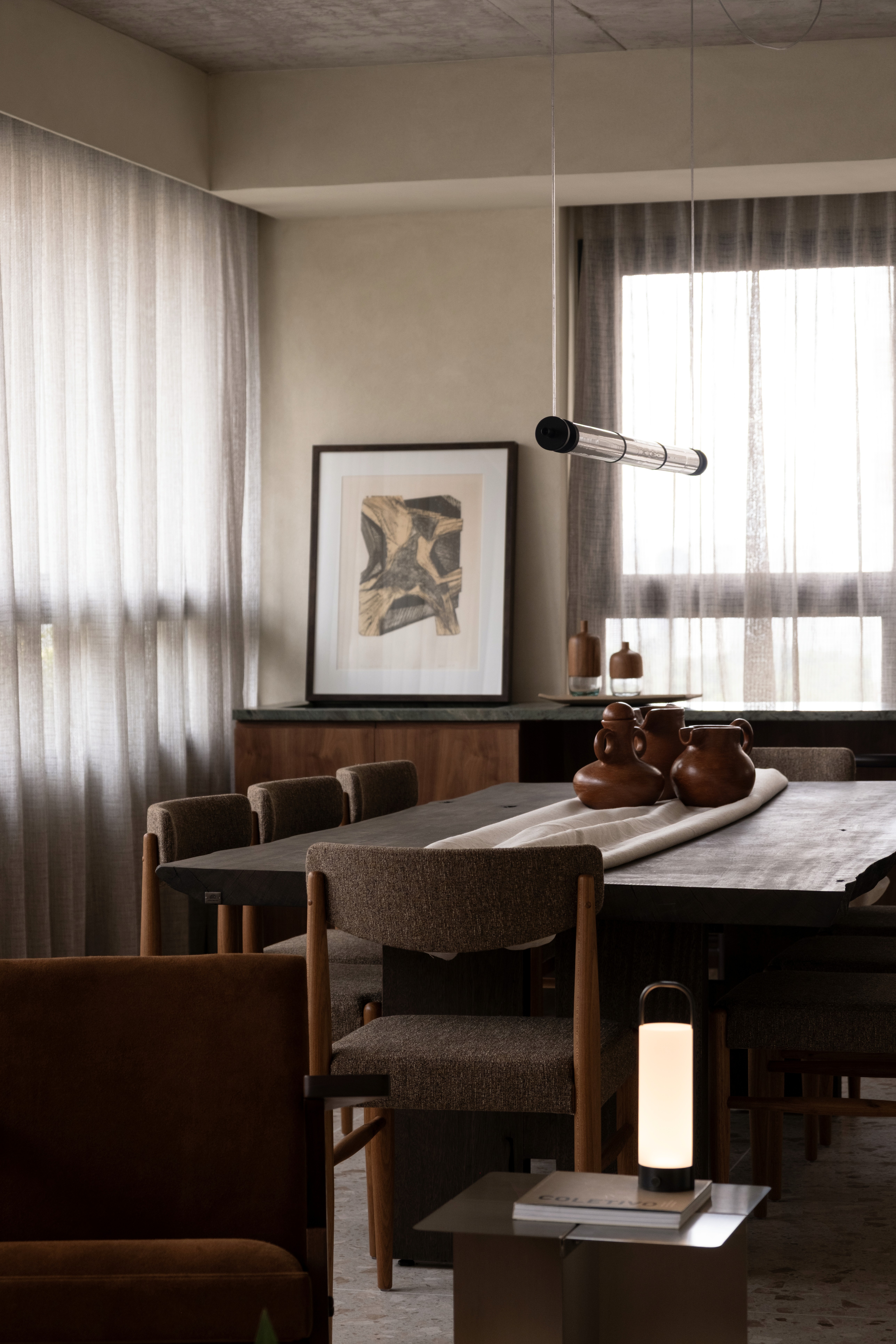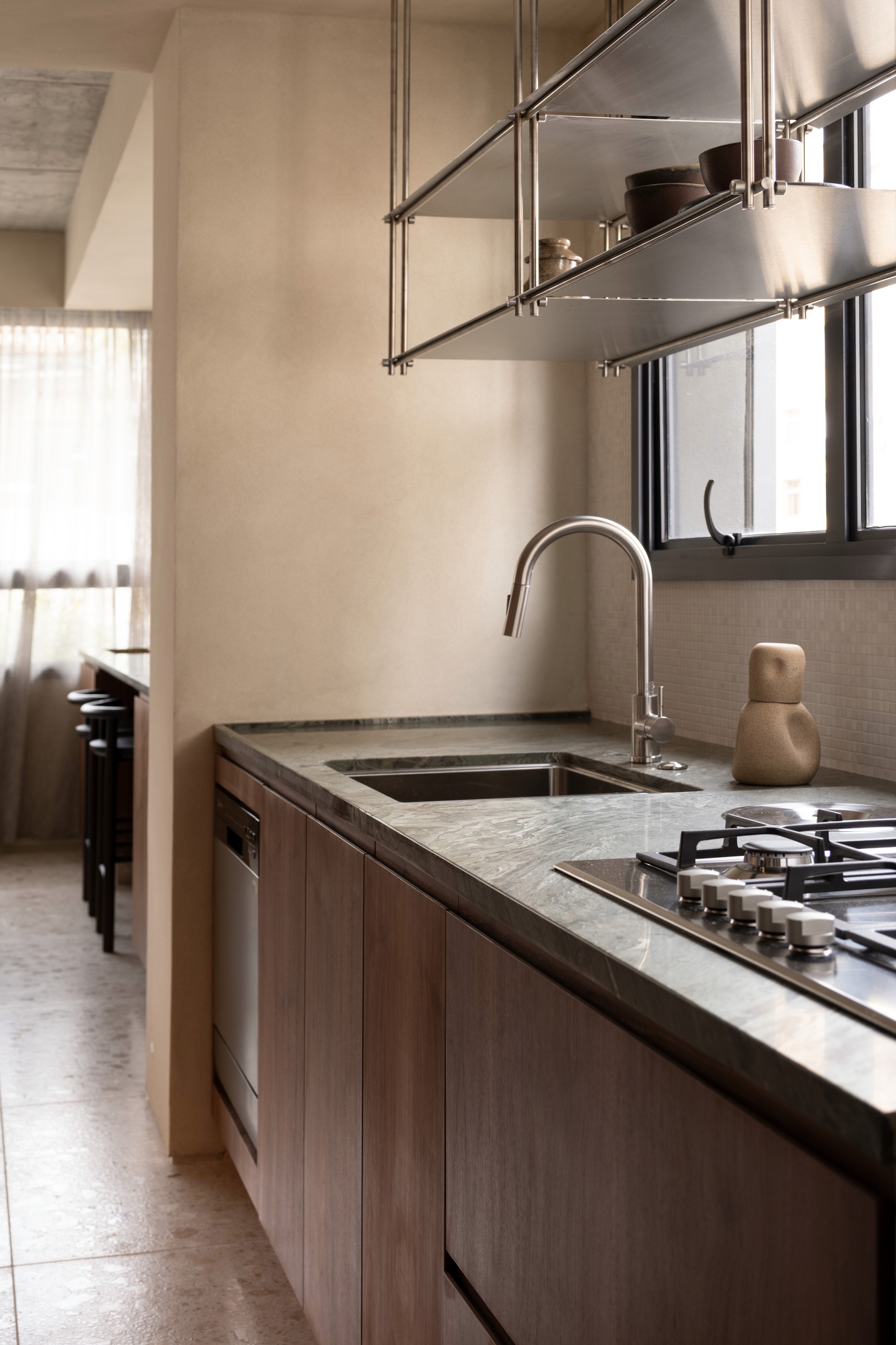 O projeto se caracteriza por uma paleta de tons terrosos e pela integração entre cozinha, estar e jantar, criando um espaço contínuo e fluido para o cotidiano. A simetria dos vãos orienta o partido arquitetônico, estabelecendo um ritmo entre os blocos de paredes e organizando a percepção do ambiente. O teto em concreto aparente foi mantido, ampliando o pé-direito e reforçando a sensação de amplitude. O piso em terrazzo, a bancada em mármore verde e o bloco de vidro no hall compõem uma atmosfera acolhedora e atemporal, onde materialidade e luz constroem a identidade do espaço.