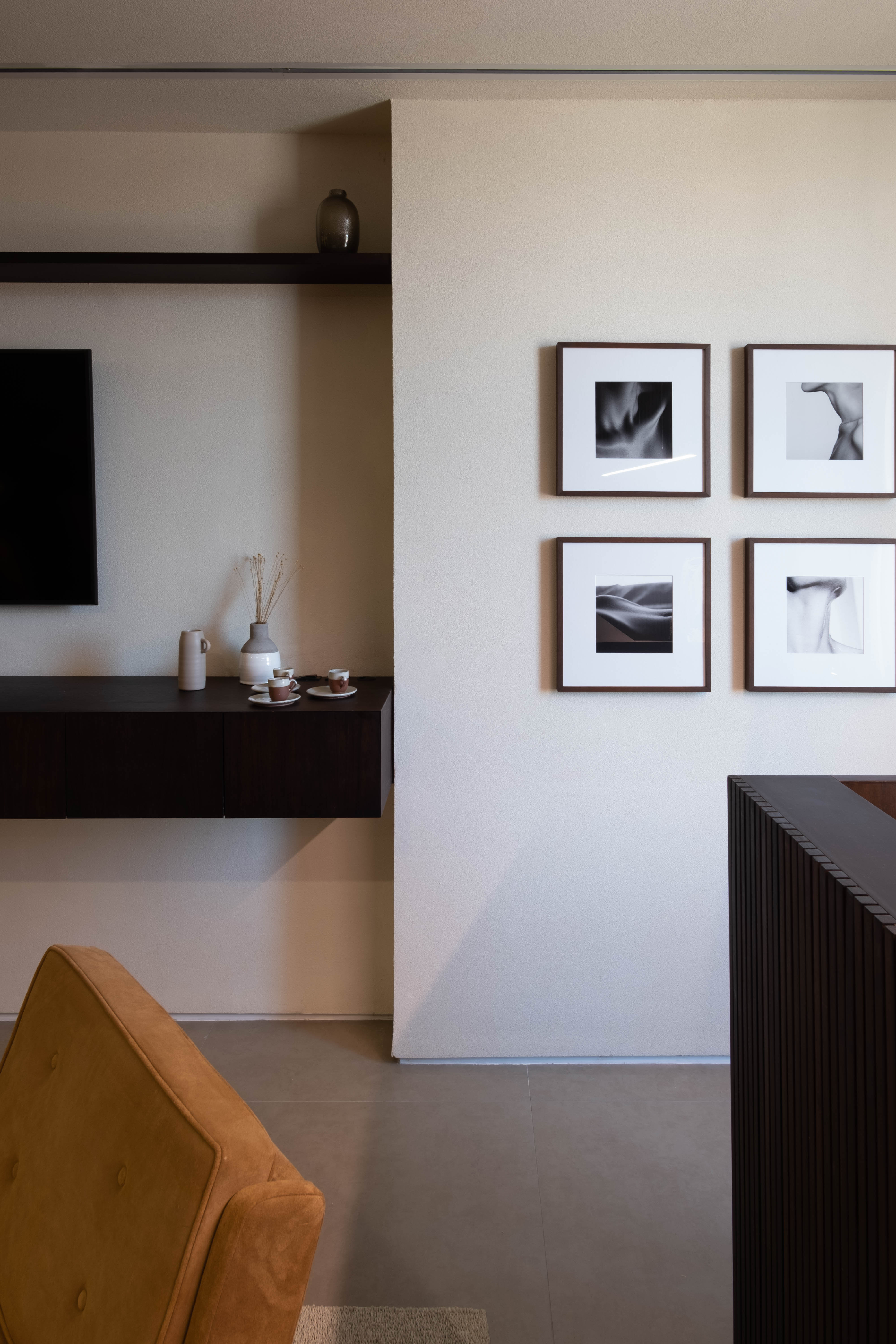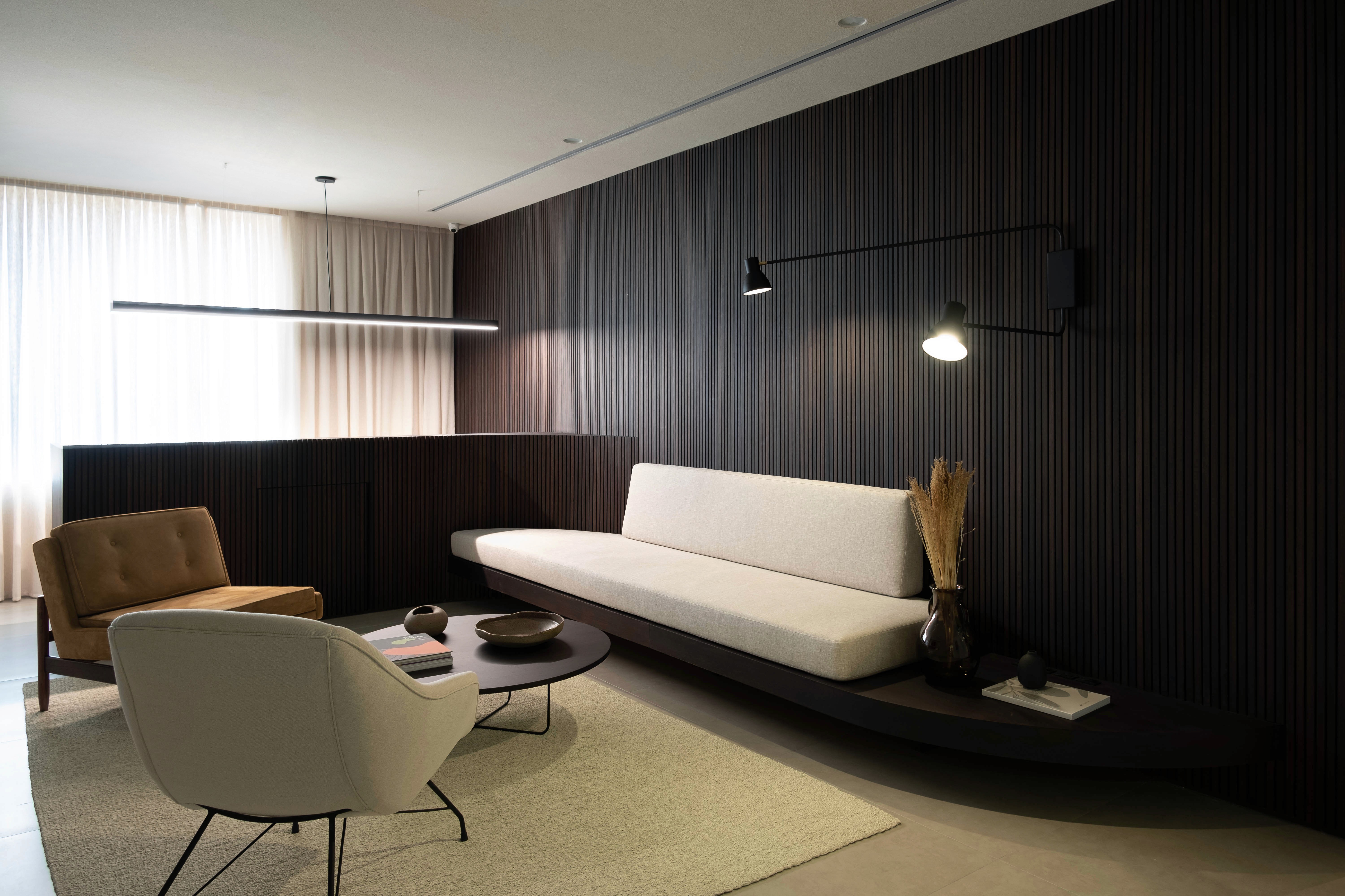 A Clínica Host traduz um conceito de originalidade que começa nas escolhas de forma e materialidade e se estende à própria dinâmica operacional conduzida pelos médicos. Pensada como uma clínica dermatológica que acolhe, o projeto busca aproximar o paciente de uma sensação de casa, mais íntima, tranquila e voltada ao bem-estar. A atmosfera nasce do equilíbrio entre referências modernas dos anos 50/60 e elementos contemporâneos, criando contrastes sutis que valorizam peças e objetos do design brasileiro. A iluminação indireta reforça essa experiência, trazendo conforto visual e construindo um ambiente intimista, acolhedor e sereno.