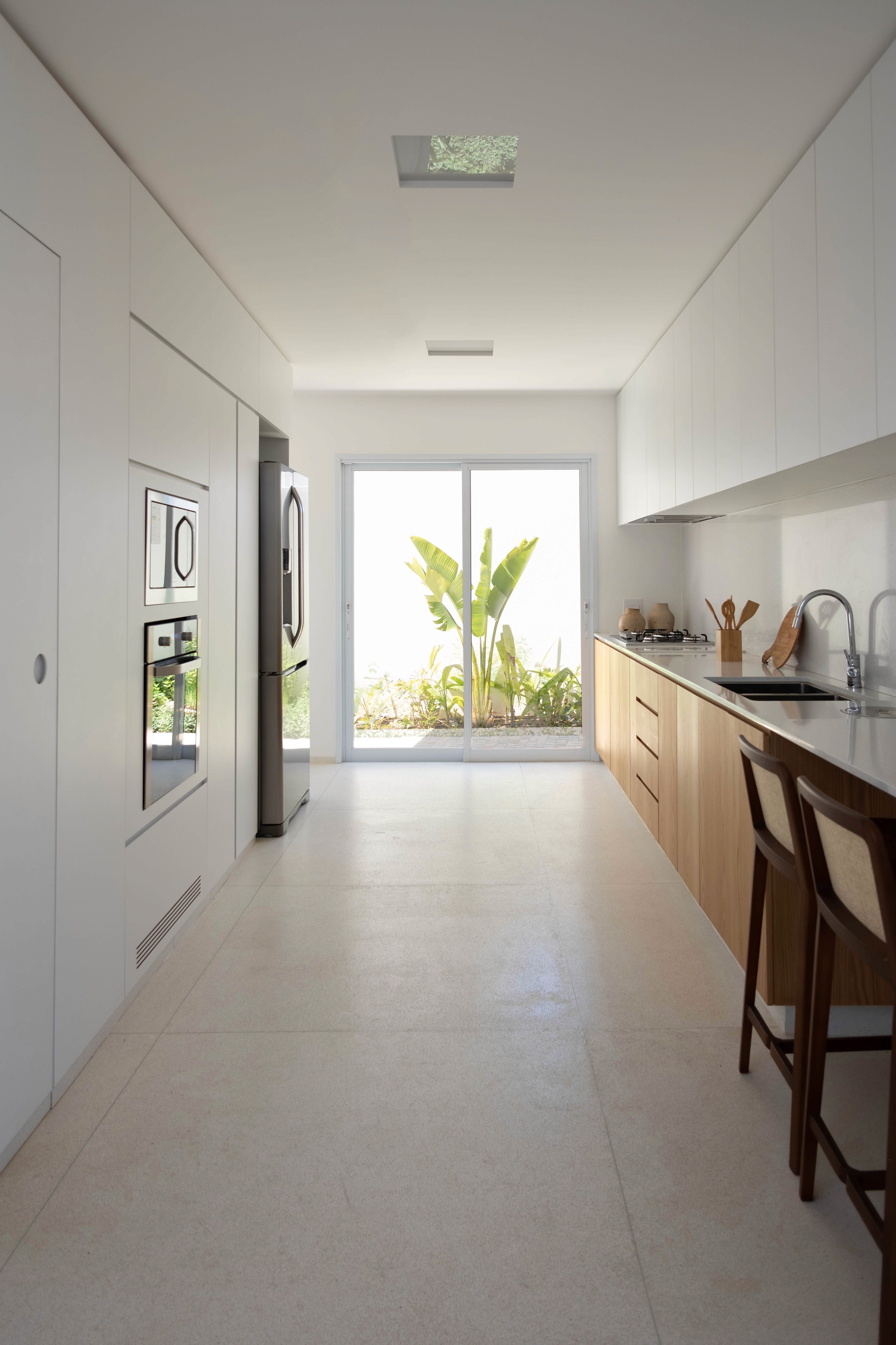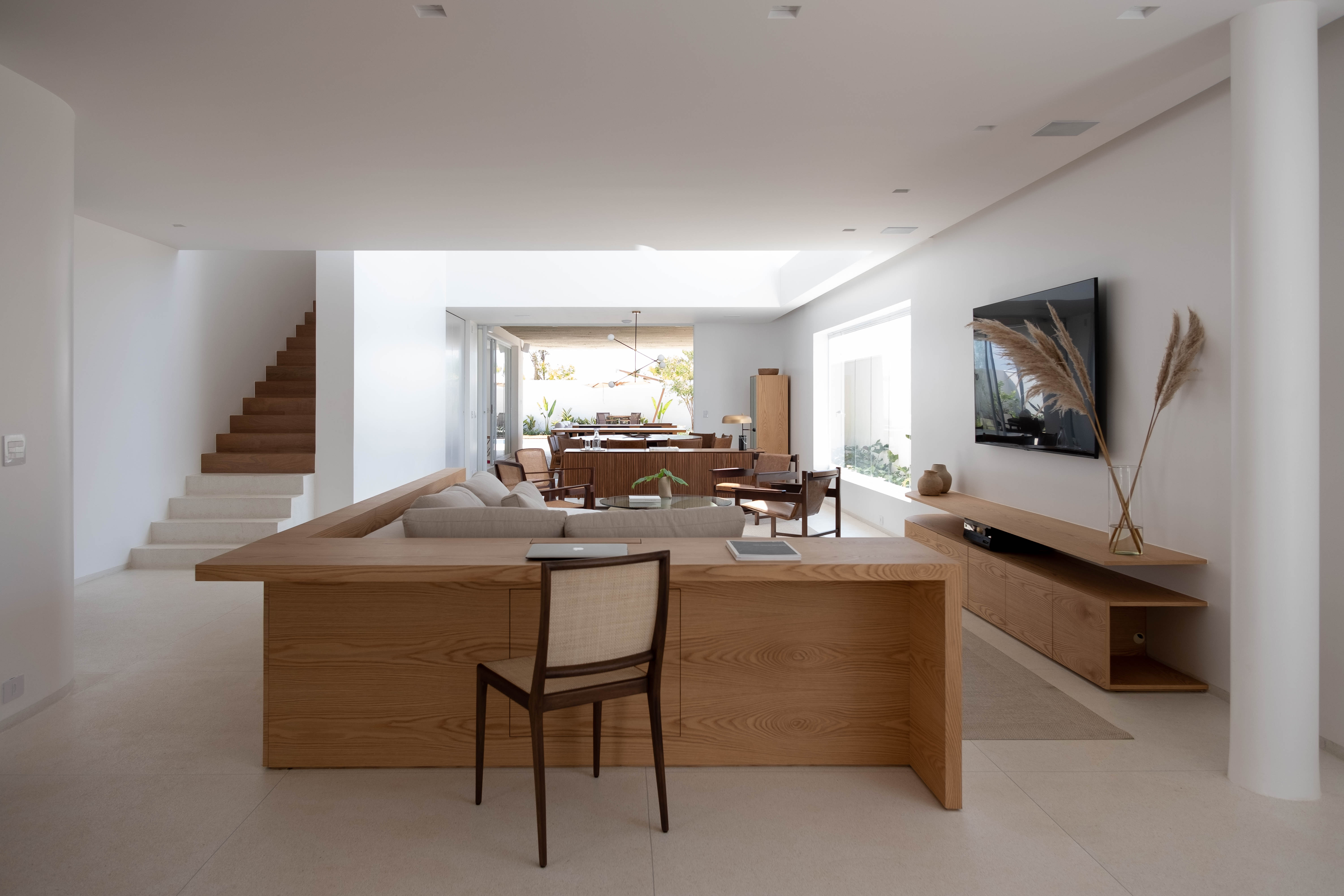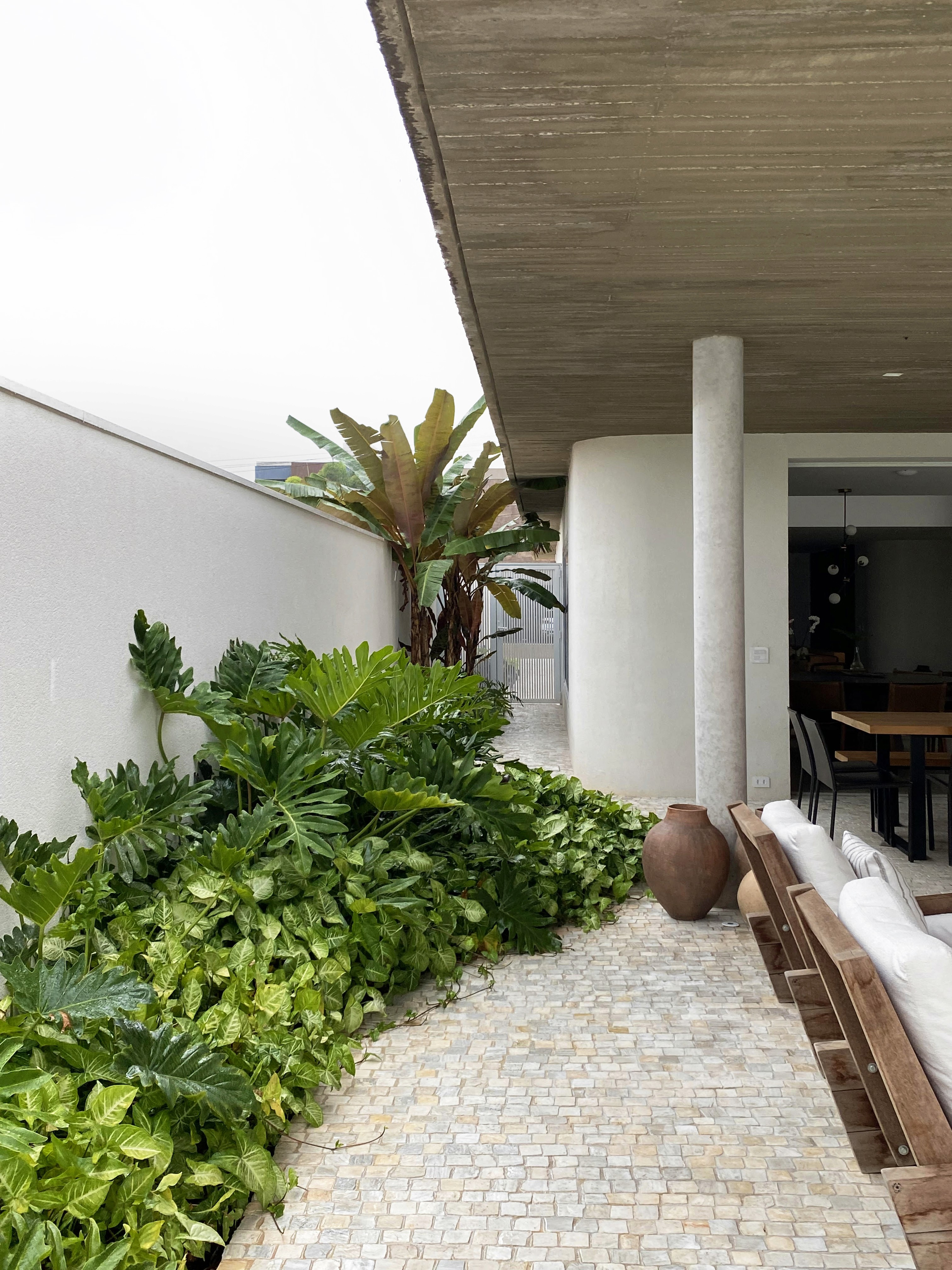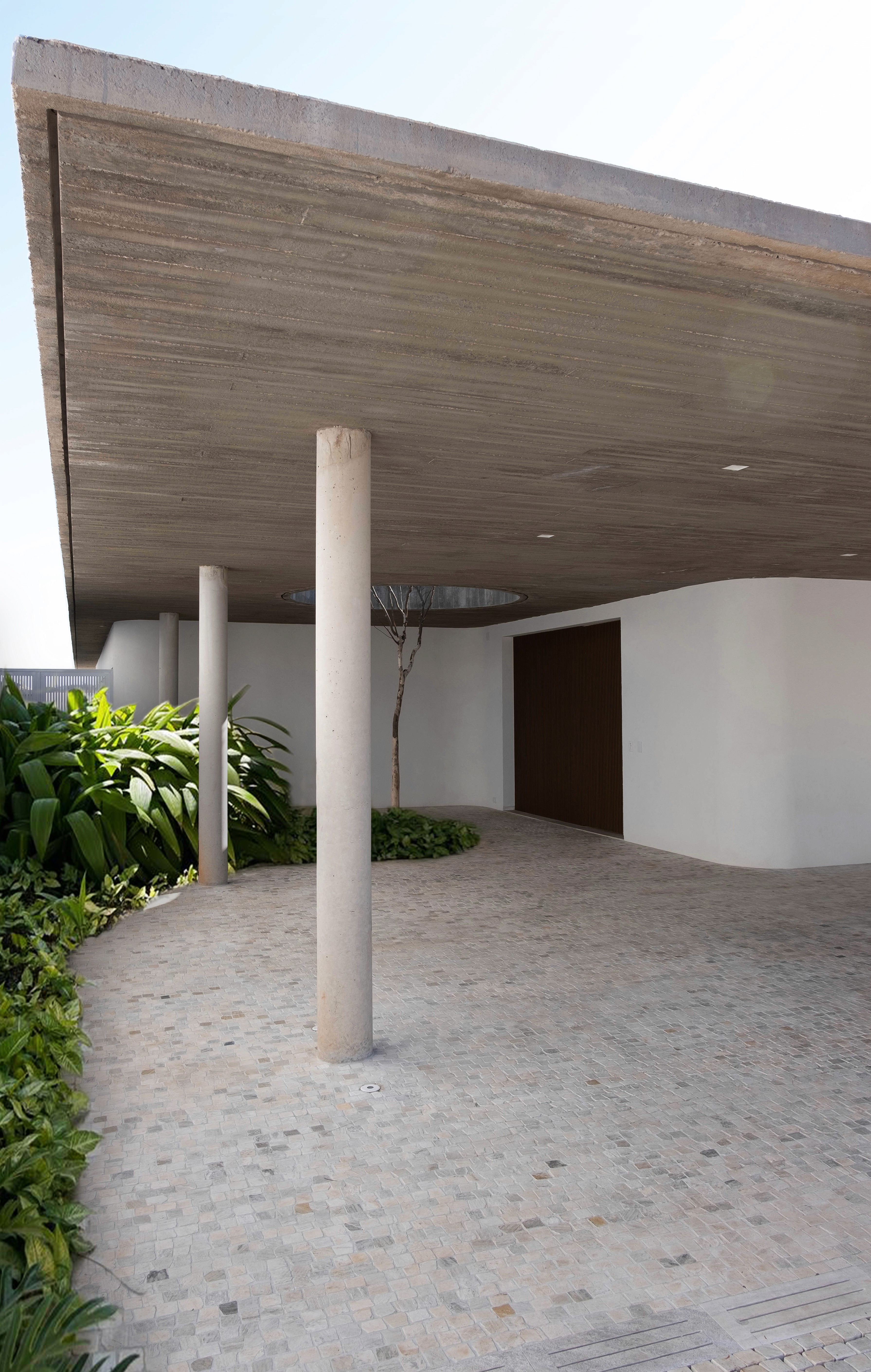 O partido do projeto parte da criação de uma grande marquise, que atua como elemento de proteção e, ao mesmo tempo, costura a integração entre os diferentes espaços da casa. As vedações curvas verticais enriquecem a geometria da construção, suavizando o perímetro e trazendo maior fluidez ao conjunto. No pavimento superior, concentram-se os dormitórios e a área íntima, garantindo privacidade e conforto. A fachada externa desse volume foi protegida por brises verticais, que qualificam o desempenho térmico, reforçam a expressão arquitetônica e asseguram maior controle de luz e privacidade.